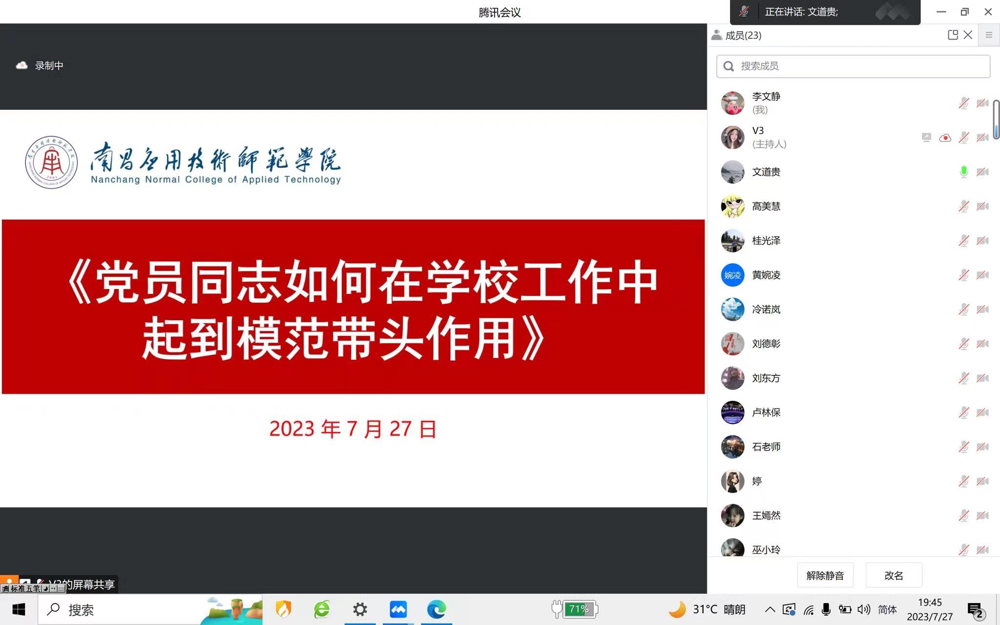 为激励引导全院广大党员、干部、群众坚定不移听党话、感党恩、跟党走,凝心聚力、真抓实干推动学院高质量发展,伟德官网于2023年7月27日开展“学风践悟 正风提能”主题教育暨2023党员学习日活动,马克思主义学院党总支书记、院长文道贵,党总支副书记李婷,副院长张丹及全体教师党员参与会议。