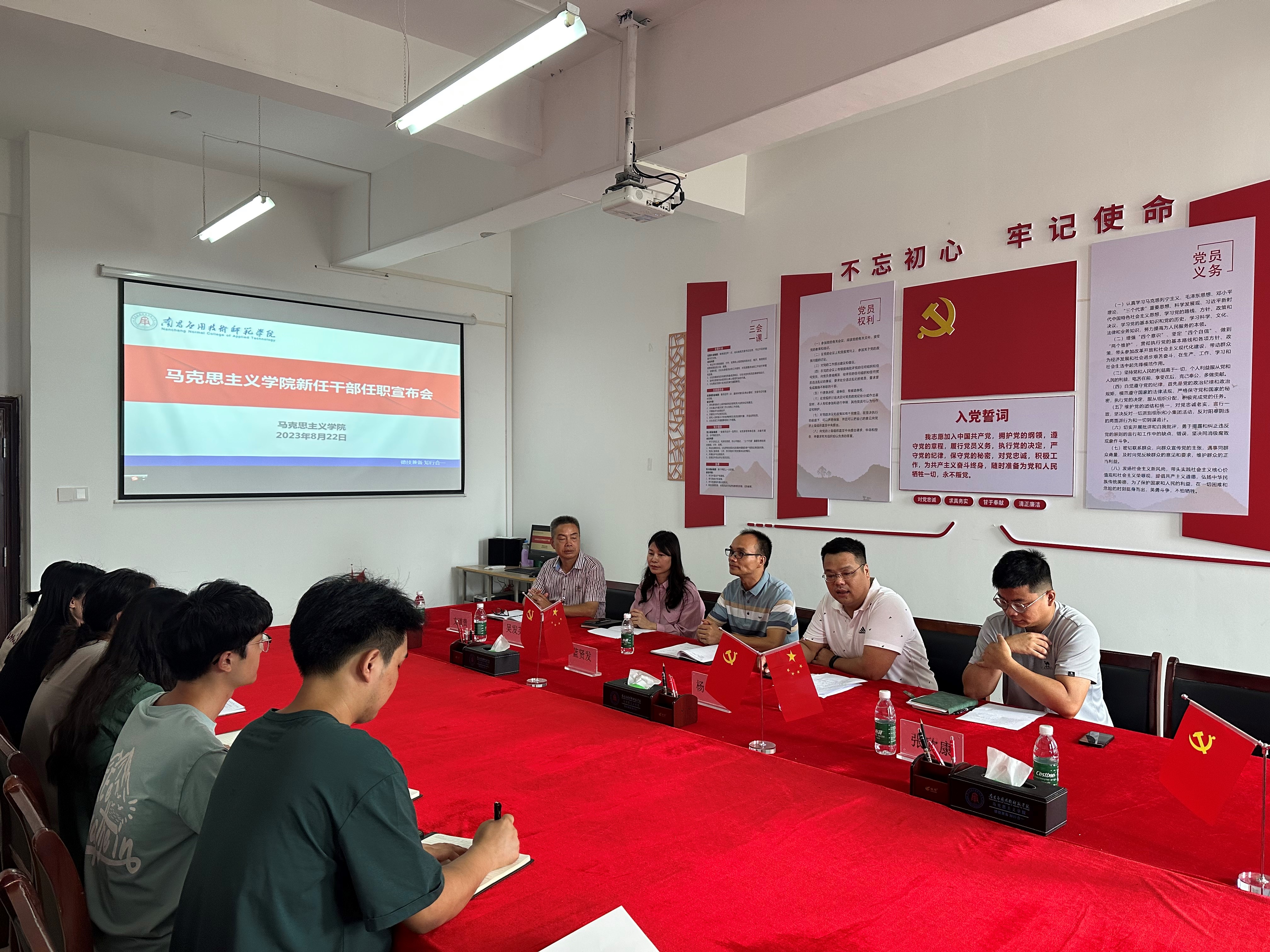 2023年8月22日上午,学校在马克思主义学院召开新任干部任职宣布会。校党委副书记蓝贤发、党委组织人事部部长杨冬、党办校办副主任吴发英出席会议。马克思主义学院领导班子成员、各科室及教师代表参加会议。会议由校党委组织人事部部长杨冬主持。