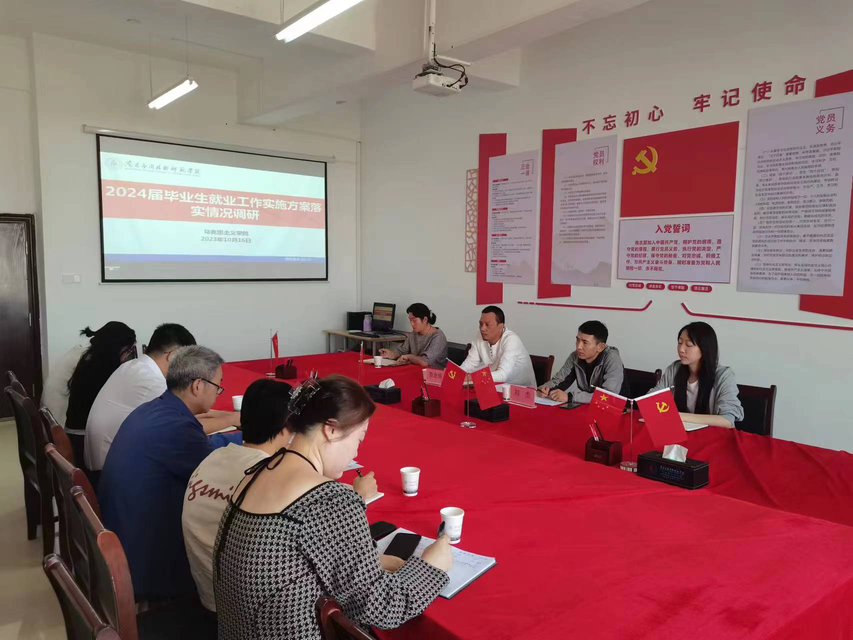 10月15日上午9:30,校长助理娄全福一行赴马克思主义学院调研,了解2024届毕业生就业工作实施方案落实情况。招就处负责人刘杰主持座谈会,马克思主义学院领导班子成员及全体毕业班辅导员参加座谈会。