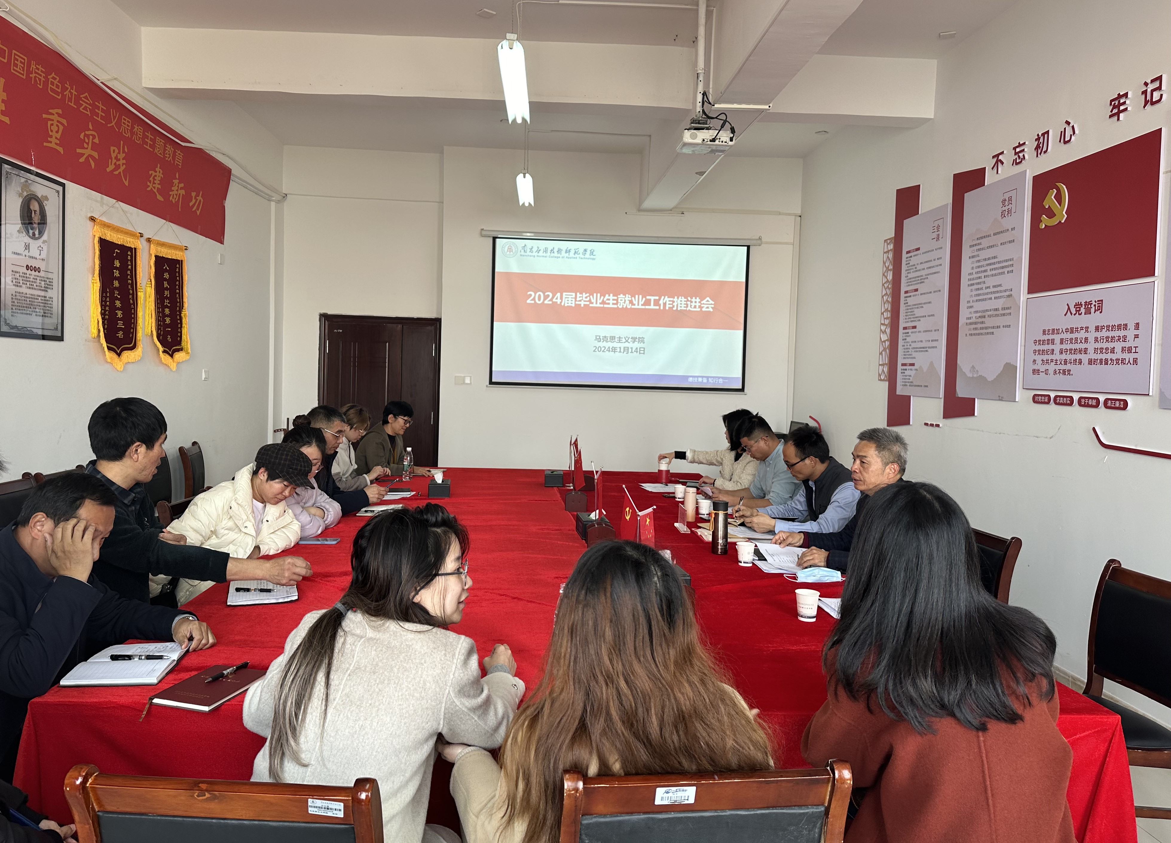 马克思主义学院于2024年1月14日在1511会议室召开2024届毕业生就业工作推进会,此次会议由院长文道贵主持,校党委副书记蓝贤发、马院党总支书记张欣康、副书记李婷、各论文实习指导老师及毕业班辅导员参会。