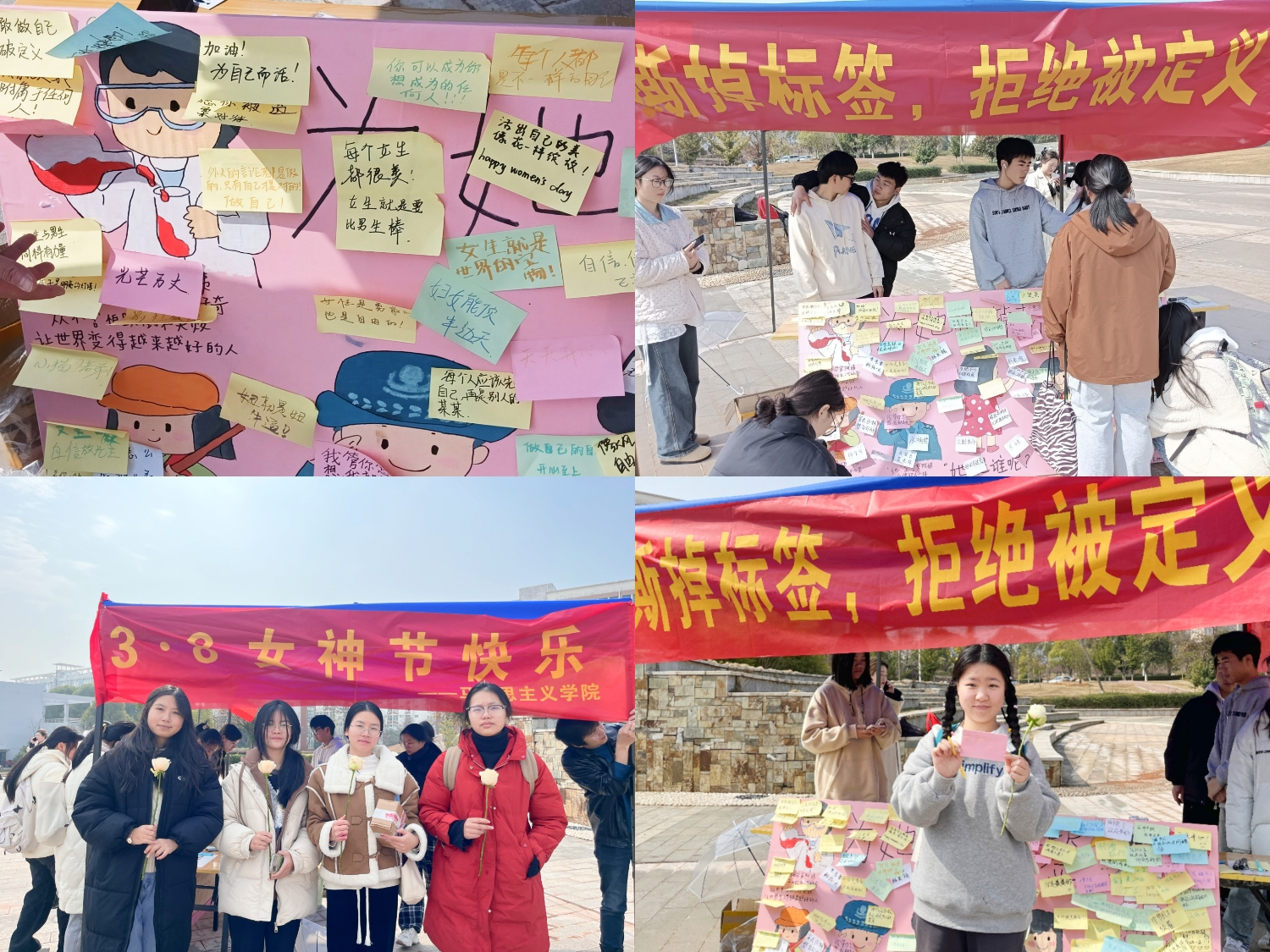 “东海随春归,发我枝上花”。在这个春意盎然的时节,“三八”国际妇女节踏着春风翩然而至,为丰富我校同学文化生活,让“她”的力量在家园文化建设中焕发光彩,发展独立自主不被时代定义的新时代女性,让女性追求更美好的自己,2024年3月8日马克思主义学院在学校世纪广场开展了“撕掉标签,拒绝被定义”的活动,向全体教职工女性和女同学致以节日的祝贺和美好的祝福。