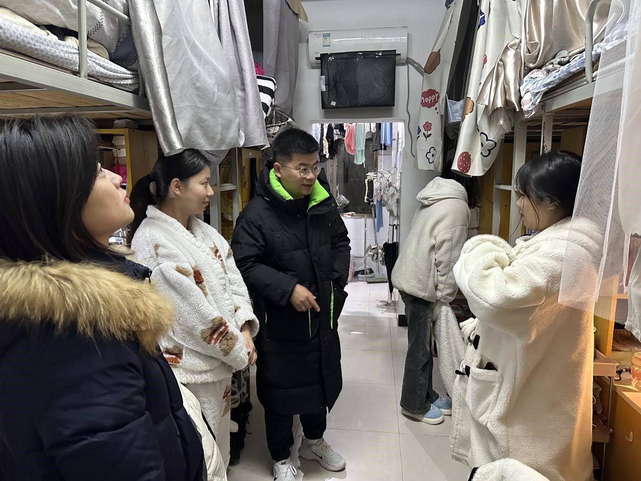 为深入加强师生交流、了解学生备考情况、切实解决学生所遇到的实际问题。12月19日晚,在学校第一次党员大会即将召开之际,马克思主义学院党总支书记张欣康、副书记李婷携全体辅导员深入学生宿舍走访,给予学生在生活与学业上的关心关爱。