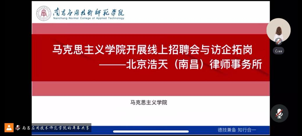 为了畅通毕业生与用人单位之间的沟通渠道,助力毕业生实现高质量就业,马克思主义学院于2024年6月26日举办了一场线上招聘会,邀请了北京浩天(南昌)律师事务所、南昌正维空间设计有限公司参加此次招聘会。此次招聘会旨在为学生提供更多的就业机会,同时帮助企业发掘优秀人才,促进双方的共赢发展。马克思主义学院党总支书记张欣康、就业专员朱文清、毕业班辅导员和部分毕业生参加了会议。