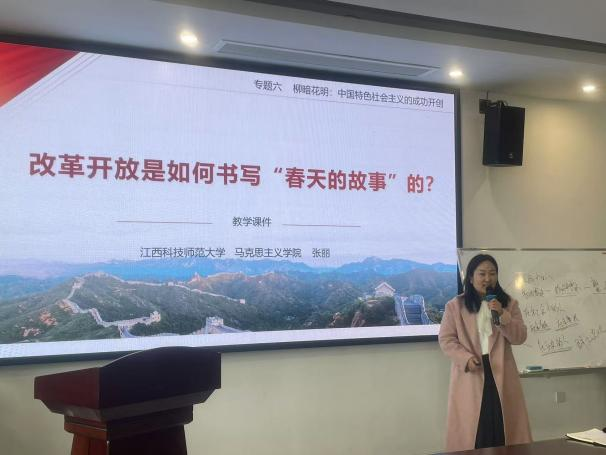 接着,省级教学成果奖获得者、江西科技师范大学马院张丽博士、青年教师郑青青分别以“改革开放是如何书写“春天的故事”的?”、“网络生活中的道德要求”为题讲授示范课。两位来访青年教师在备课准备、教学组织、AI技术手段融入课堂等环节,通过诗意的语言为我们生动地讲述了《习近平新时代中国特色社会主义思想概论》《思想道德修养与法治》精彩片段,通过主题讨论、数据分析、随堂训练、与人工智能对话等多种教学手段,为伟德官网老师带来了一场充满互动与创新的课堂体验。