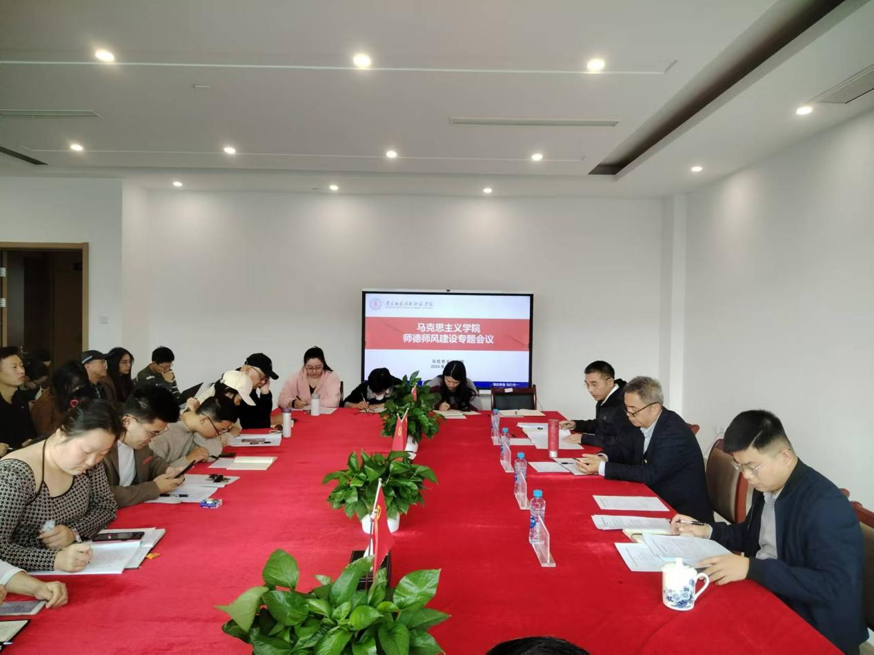 为进一步规范学院全体教职工教学、生活等方面日常行为,持续巩固学院师德师风建设成果,教育引导职工受警醒、明底线、知敬畏、守底线,营造风清气正的教书育人环境。10月29日下午,学院于赣新校区503会议室召开师德师风建设专题会议。党总支书记张欣康,院长文道贵,副院长刘德彰及全体教职工参加会议,党总支副书记李婷组织九龙湖校区教职工同步参加线上会议。会议由党总支书记张欣康主持。