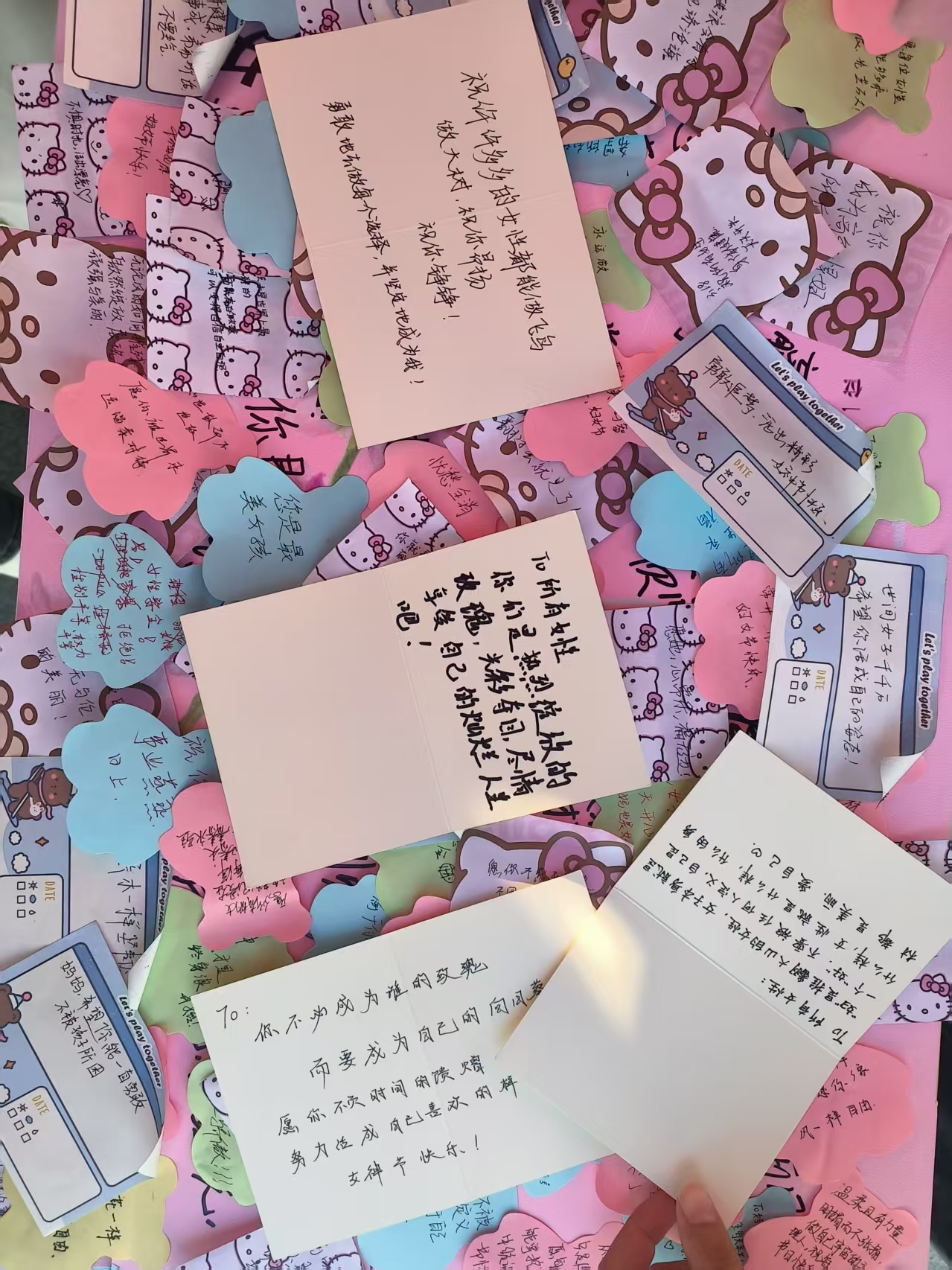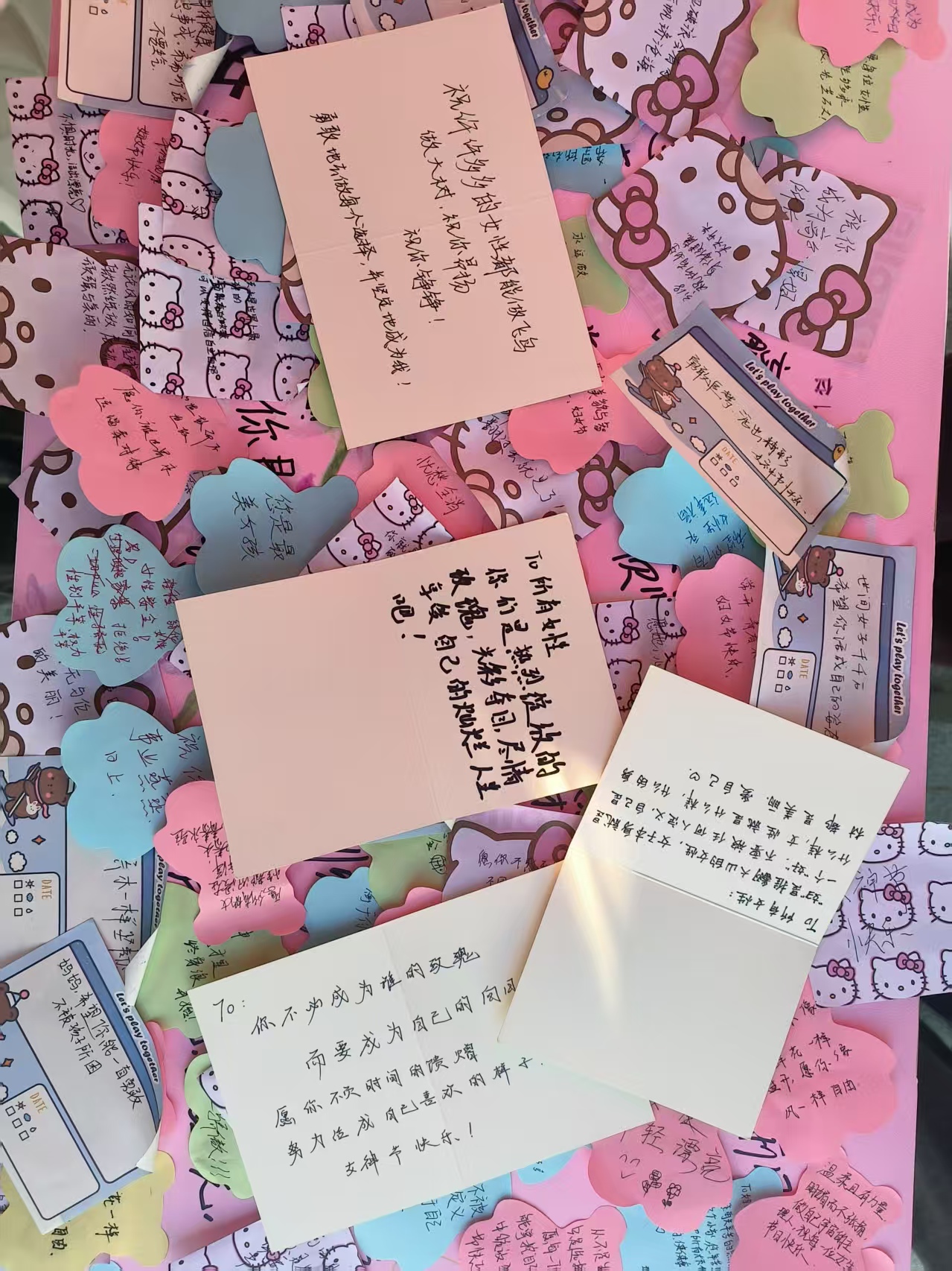 活动现场,色彩斑斓的马克笔整齐排列着。随着同学们的热情涌入,他们迅速汇聚在以庆祝三八妇女节为主题的海报周围,用纸笔将心底对女性的无限崇敬与美好祝愿一一记录。同学们或沉思、或奋笔疾书,有的为远方牵挂的母亲送上温馨的思念,有的为身边的女性朋友写下真挚的友谊赞歌,还有的则是将这份特别的礼物赠予自己,以文字记录自我鼓励与成长的足迹。整个现场弥漫着温馨、积极而又充满力量的氛围,成为了这个特别日子里一道亮丽的风景线。