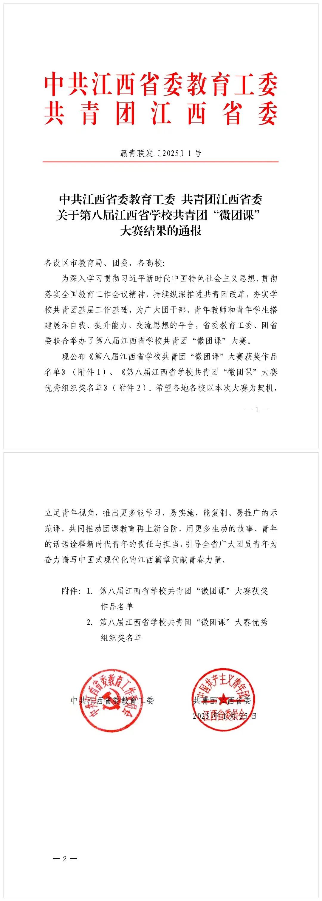 近期,我校师生在省委教育工委、团省委联合举办了第八届江西省学校共青团 “微团课”大赛中取得了优异成绩。其中伟德官网胡琛老师获三等奖。