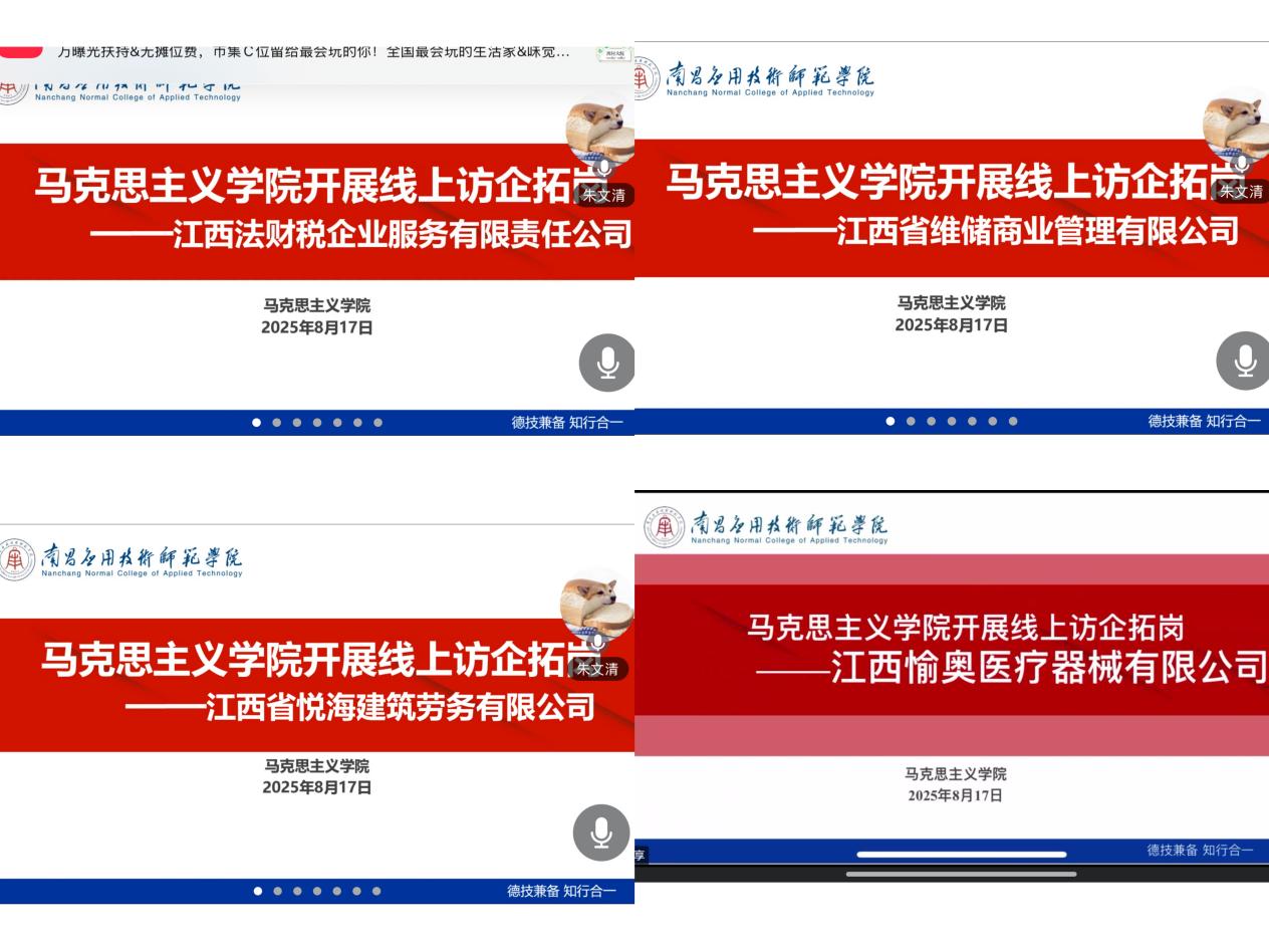 2025年8月17日上午,伟德官网与江西法财税企业服务有限责任公司、江西省维储商业管理有限公司、江西省悦海建筑劳务有限公司、江西愉奥医疗器械有限公司开展校企合作,洽谈会在腾讯会议举行。伟德官网党总支书记张欣康,企业领导参加会议,会议由朱文清主持。