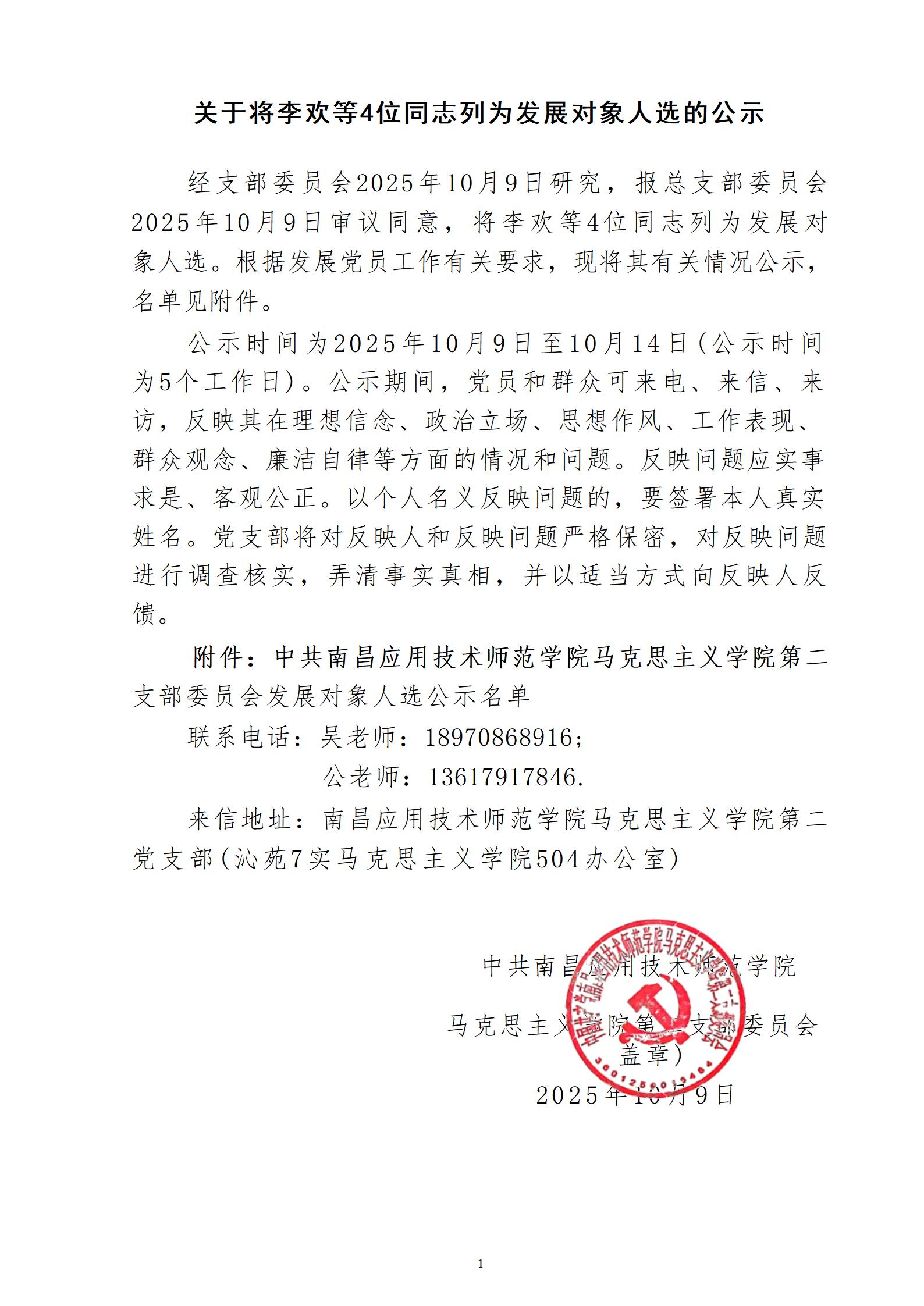 首页栏目 通知公告 学院新闻 习近平思想学习专栏 主题教育学习 院长书记信箱 您现在的位置是:首页 > 首页栏目 > 通知公告 关于将李欢等4位同志列为发展对象人选的公示 管理员2025-10-09298 上一篇 BV伟德官方网站马克思主义学院2024-2025 学年度国家奖学金名单公示 下一篇 中共BV伟德官方网站马克思主义学院党总支委员会关于“党员先锋岗”推荐对象的公示