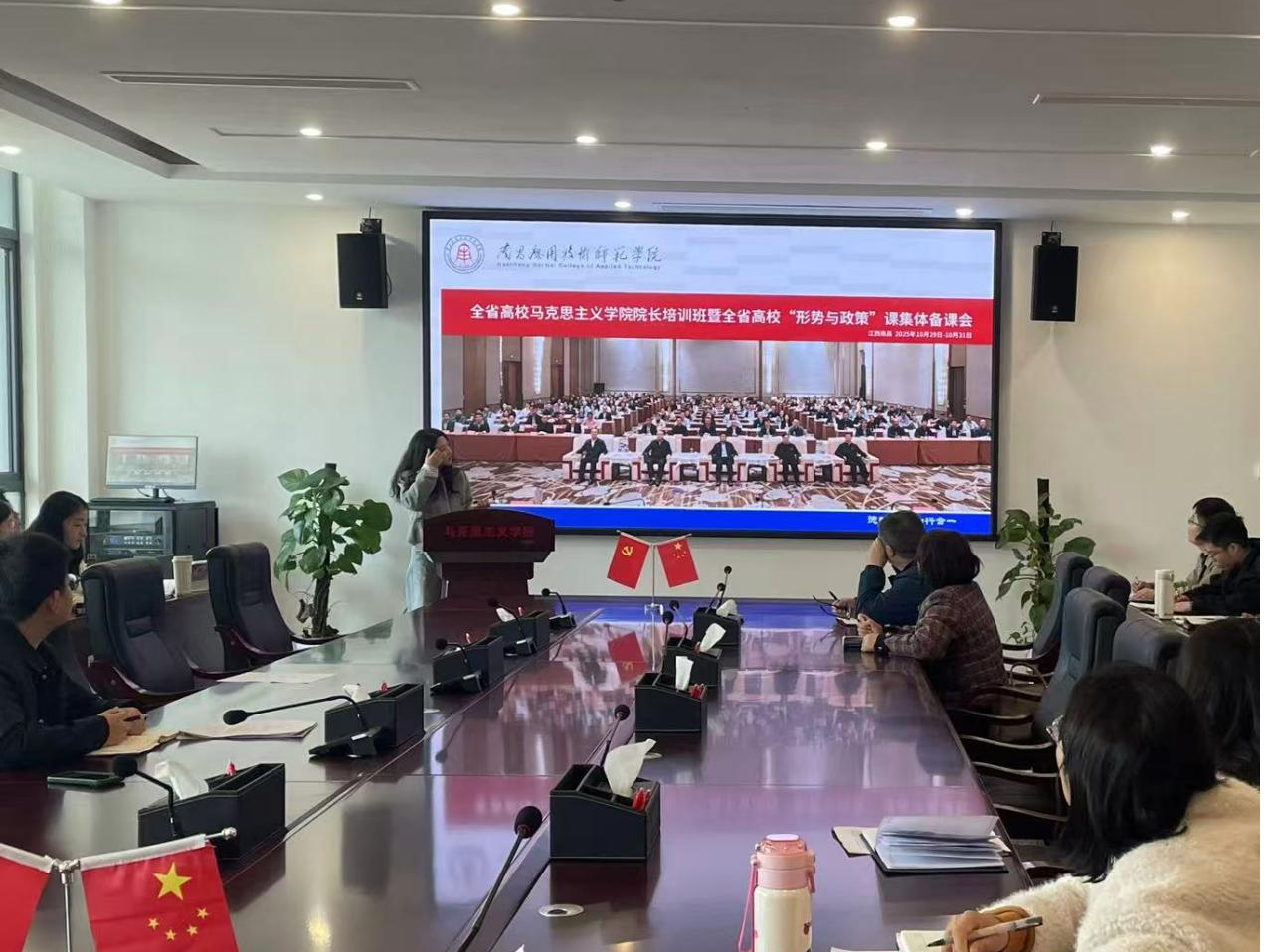 随后,思政教师李维就10月30-31日在南昌举行的江西省高校马克思主义学院院长培训班暨全省高校“形势与政策”课集体备课会作专题分享。她传达了备课会上《国内经济形势及十五五规划解读》《携手周边国家共创美好未来,推动构建新形势下国际关系》《解读二十届四中全会精神》三个讲座重点内容,并对部分高校“形势与政策”课开课情况及课程未来发展进行了分享。全体与会人员共同观看学习了集体备课会上第四届全国高校思政课教学展示活动形策课参赛选手的现场教学展示视频。