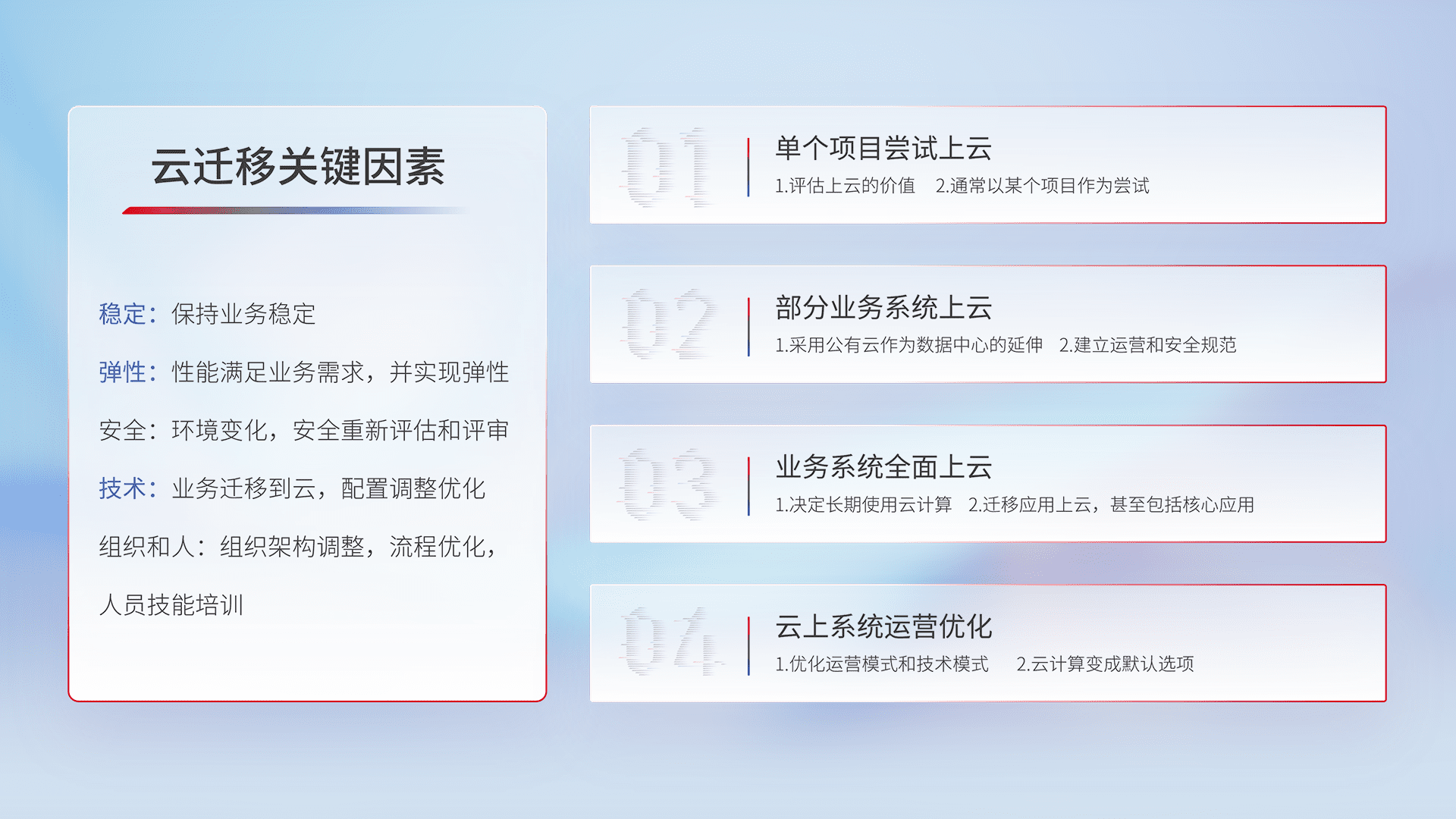 结合实际业务,,,,从规划设计、、云平台选型、、、、云原生改造、、数据迁移、、、集成交付,,迁移全过程为客户识别最佳上云路径,,,,做好风险识别管理,,设计网络架构、、、身份权限、、安全审计合规、、操作审计、、、、日志审计、、、监控告警策略、、、、多站点容灾设计等,,对云上基础设施进行整体规划,,提升IT治理水平,,,,以满足弹性、、、高可用、、、、高性能的需求。。
